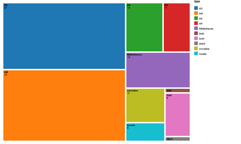 Parmi les fournisseurs de données : 33 services d'archives municipales (72 jeux de données) et 15 services d'archives départementales (67 jeux de données).