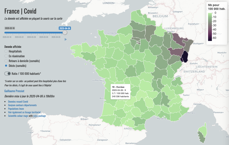 COVID19 : choroplèthe animée avec données d'hospitalisation Santé Publique FranceGuillaume Pressiatpublié le 6 avr. 20202K0